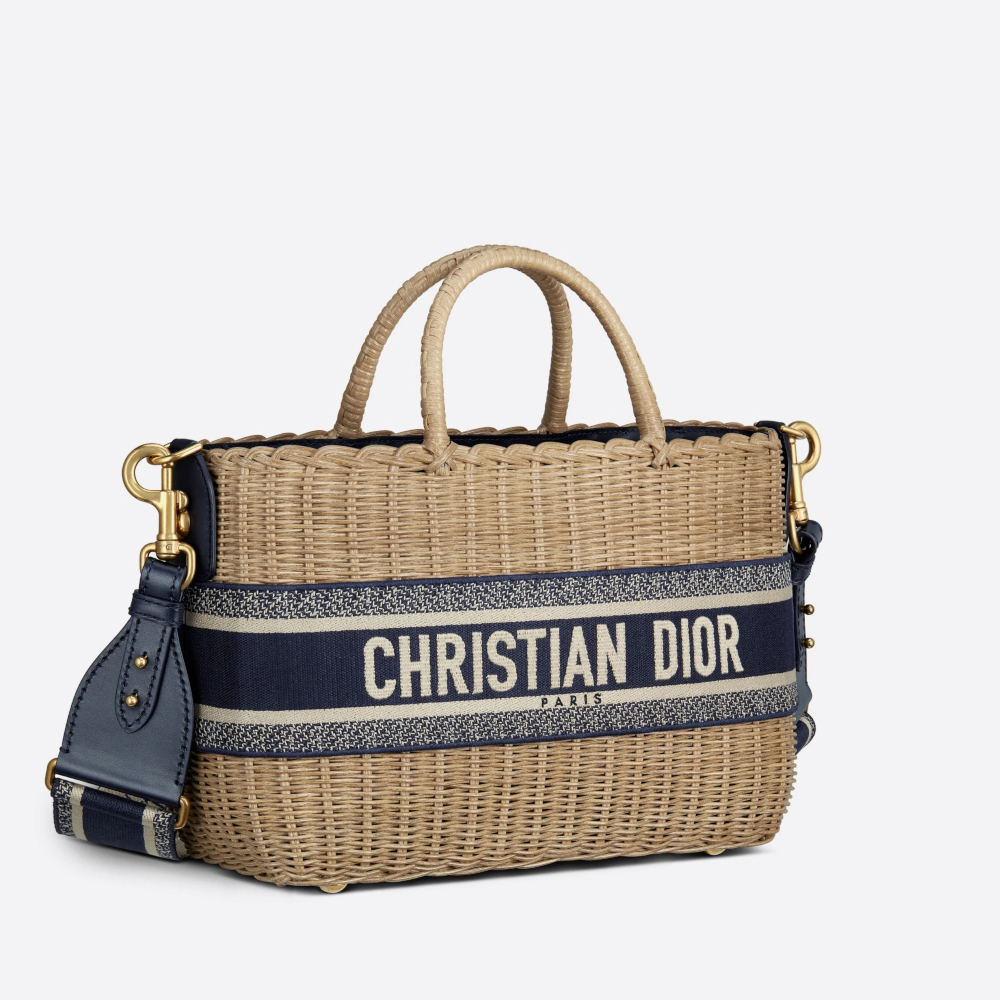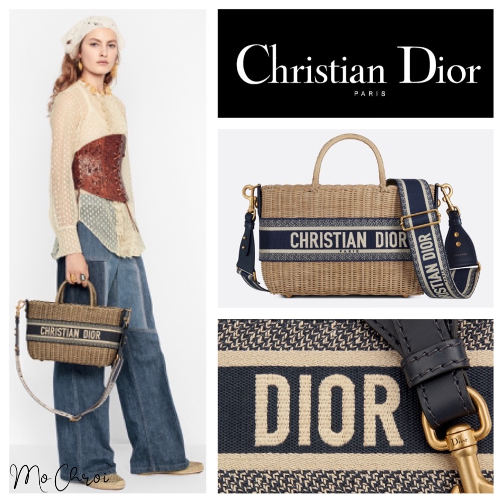 The new Dior Wicker basket bag is hand-knitted from natural wickers for a timeless design. The blue Dior Oblique Jacquard inner bag, zip pockets and drawstring embody the Maison’s classic savoir-faire. Inspired by the iconic Dior Book Tote, the bag features a band embroidered with the Christian Dior signature. The wide embroidered shoulder strap can also be used as a shoulder bag or crossbody bag.